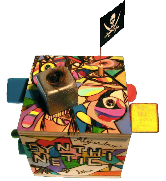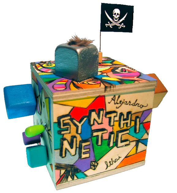 Gearhead DC Motors, capacitors, wires, switches, buttons and furry fingertip drain hole. Synthinetic is a kinetically powered noise box built by Ithai Benjamin and Alex Abreu.